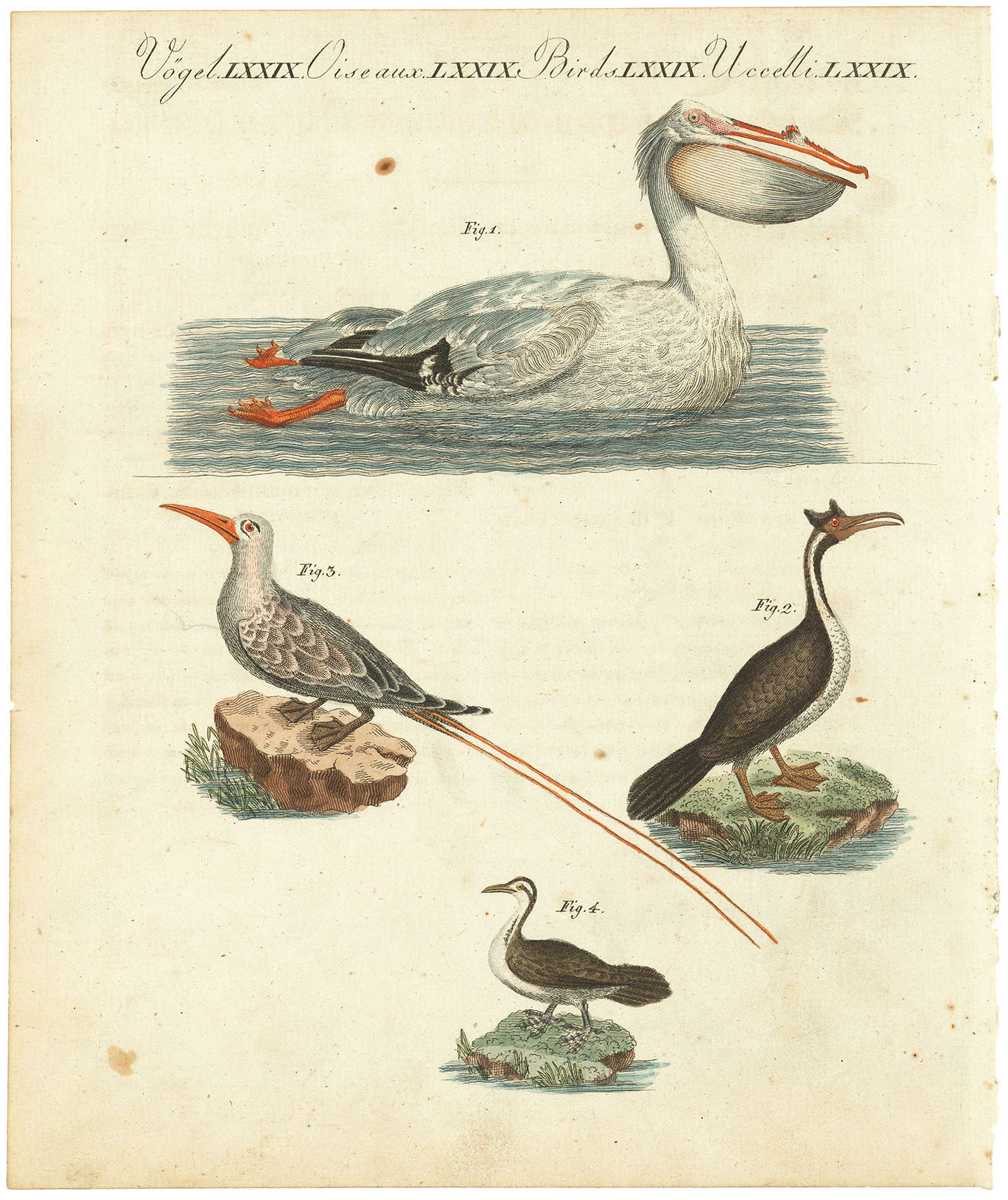DESCRIPTION: From Bilderbuch fur Kinder by F. J. Bertuch, this plate (Vogel LXXIX) depicts a group of four birds, accompanied by a separate sheet of descriptive text in French and German. The species illustrated are: 1) Pelican, 2) Spotted shag, 3) Red-tailed tropicbird, and 4) Grebe. Bertuch’s richly detailed hand-colored engravings were originally designed to educate and delight, presenting natural history subjects with scientific accuracy and visual appeal for a young audience.
