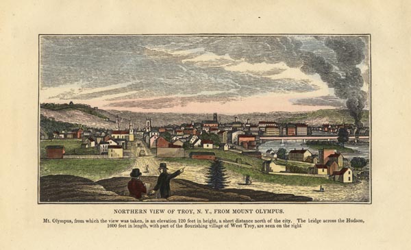 DESCRIPTION: Text under title line: "Mt. Olympus, from which the view was taken, is an elevation 120 feet in height, a short distance north of the city. The bridge across the Hudson, 1600 feet in length, with part of the flourishing village of West Troy, are seen on the right." From "Historical Collections of the State of New York" by Henry Howe and John W. Barber.