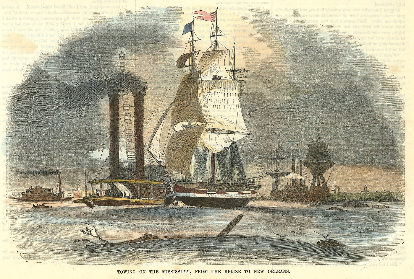 DESCRIPTION: A 19th-century perspective of Towing on the Mississippi from the Belize to New Orleans, captured as a wood engraving and handcolored to highlight the details. This 1856 scene shows steamboats towing sailing vessels, illustrating the transition from sail to steam power. The handcolored details highlight the changing technology and the growing dominance of steam over traditional sailing ships on the Mississippi River.