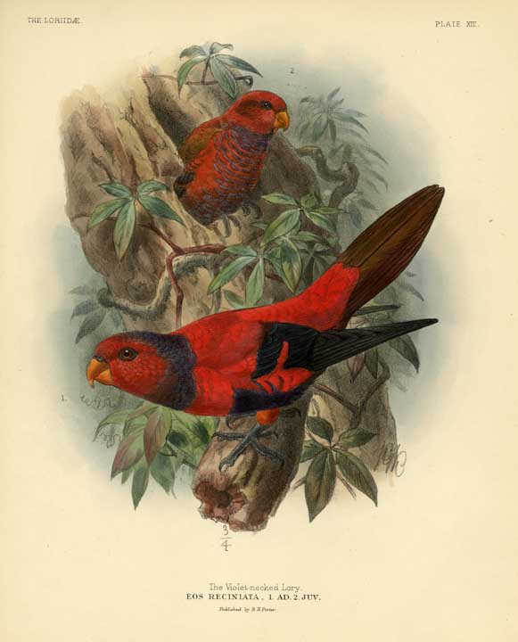 DESCRIPTION: From "A Monograph of the Lories or Brush-Tongued Parrots" by St. George Mivart. Keulemans was among the finest ornithological artists of the latter 19th-century. He was prolific and in great demand among scientists who wanted him to illustrate their works. In almost every case his drawings are highly accurate and detailed, usually set in an appropriate landscape background.