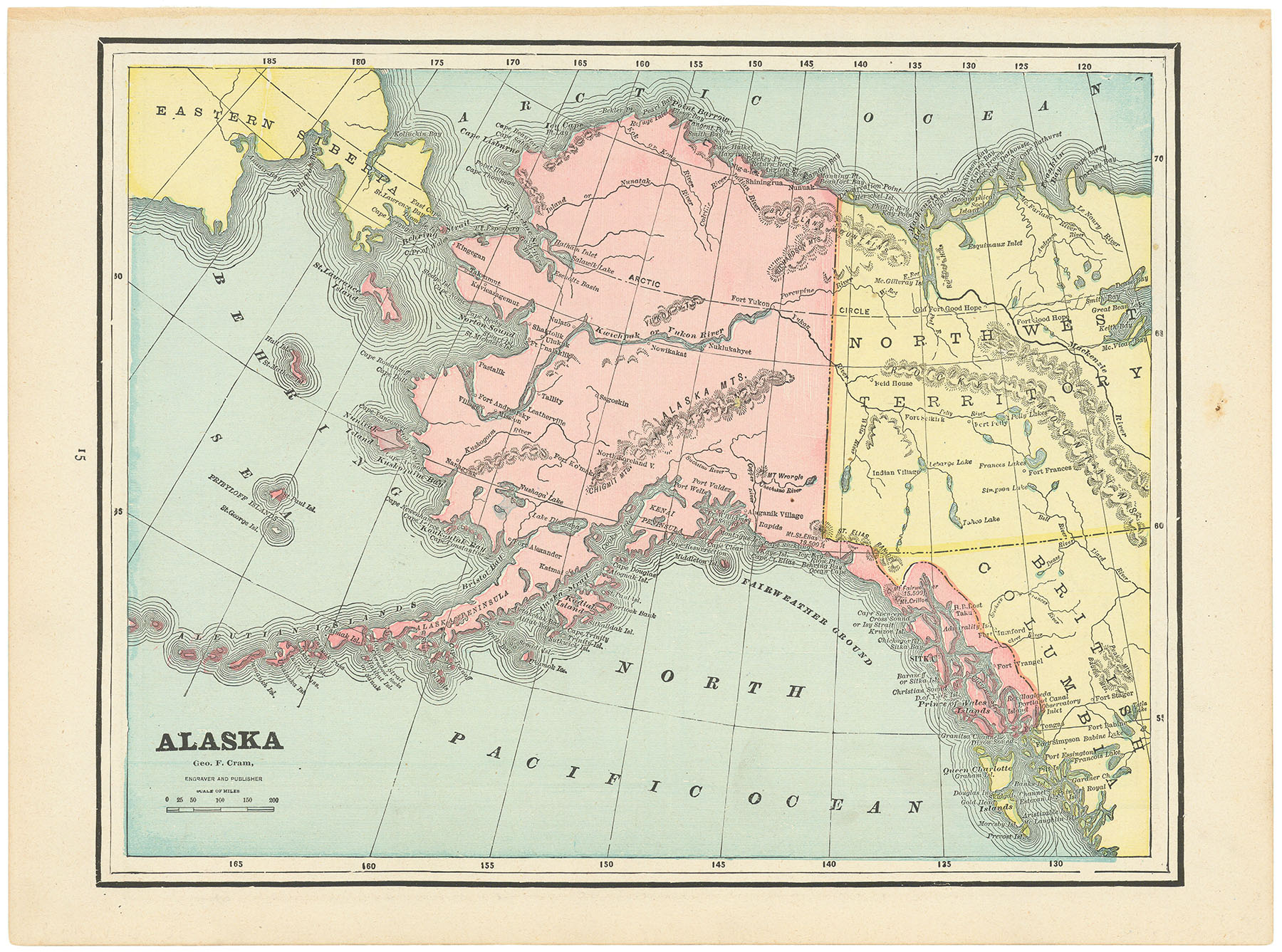 DESCRIPTION: "Alaska", printed in 1892.Published by Henry S. Stebbins in Chicago, this map by George Cram offers a detailed view of Alaska’s rugged coastline, islands, and inland regions at a time when much of the territory remained little explored. Its clean design and careful engraving reflect Cram’s reputation as one of America’s leading mapmakers. Issued just 25 years after the Alaska Purchase, it underscored the region’s emerging value for its natural resources and strategic position in the North Pacific.