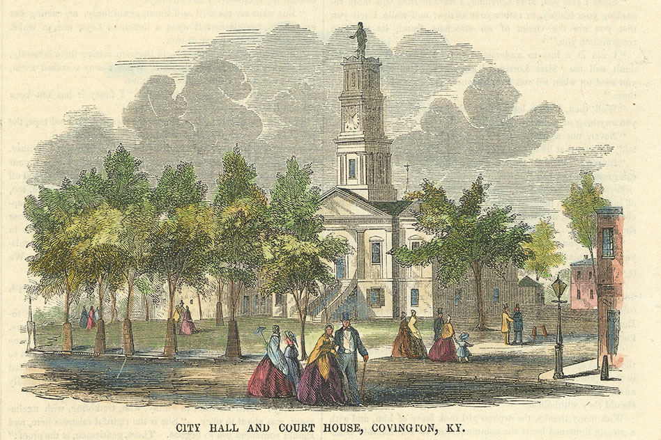 DESCRIPTION: A 19th-century perspective of City Hall and Court House, Covington, Ky, captured as a wood engraving and hand colored to highlight the details.