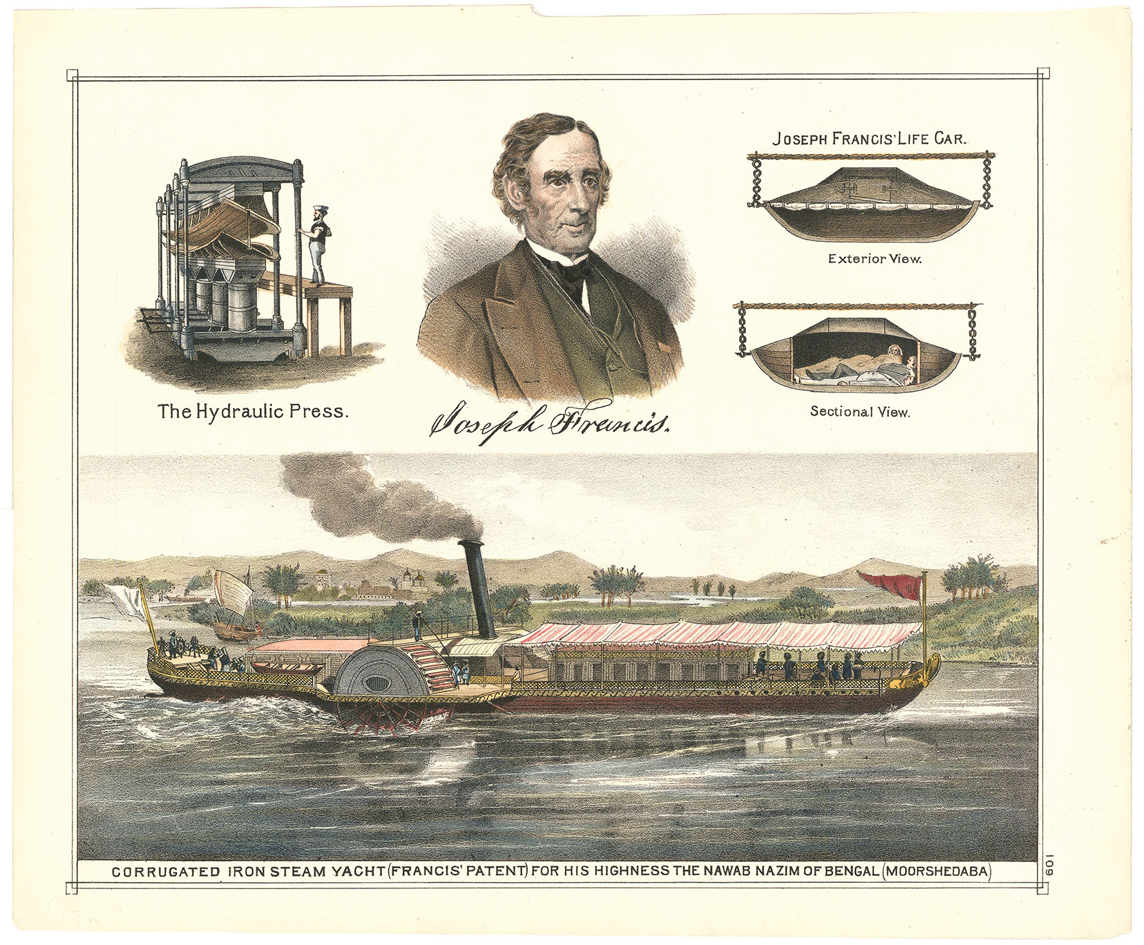 DESCRIPTION: Plate 109. Above the side view of the steam side-wheeler are vignettes of the hydraulic press, inventor Joseph Francis, his "life car" and a sectional view.