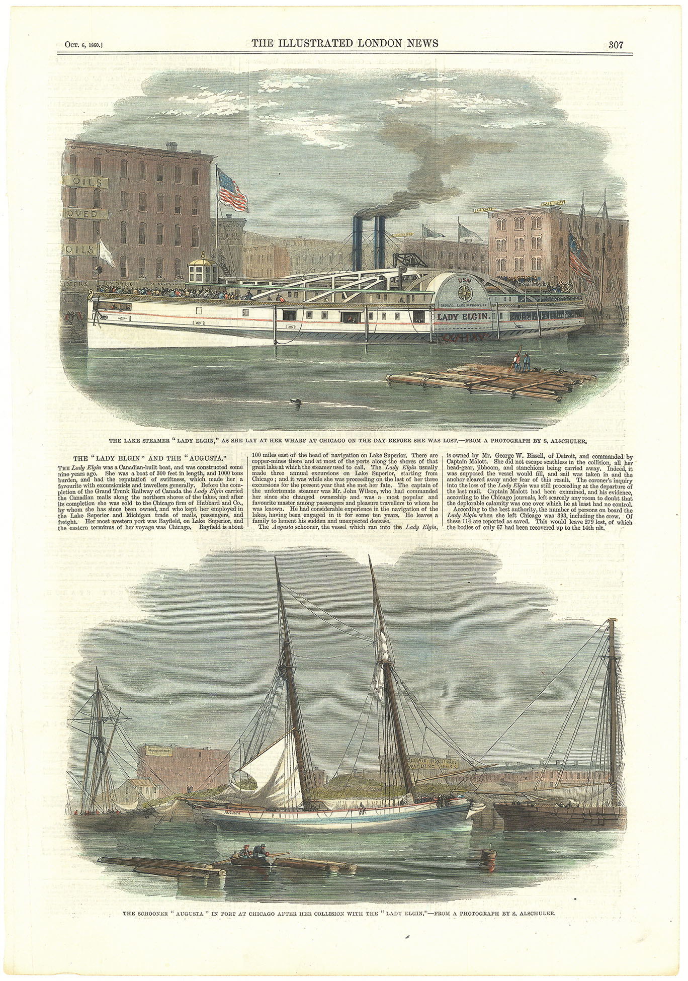 DESCRIPTION: These paired scenes frame one of the worst maritime disasters on the Great Lakes. The Lady Elgin is shown lying quietly at her Chicago wharf on the day before her final voyage, an image of routine lake travel before tragedy struck. Hours later, after a nighttime collision on Lake Michigan, the Lady Elgin sank with heavy loss of life, while the schooner Augusta, damaged but afloat, returned to Chicago.