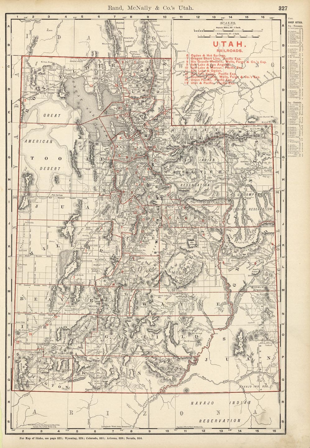 DESCRIPTION: The map depicts counties, township lines, and topographical details. Index of chief cities appears in left margin, and full index of cities and town on reverse. A key in red ocates railroad lines across the state.