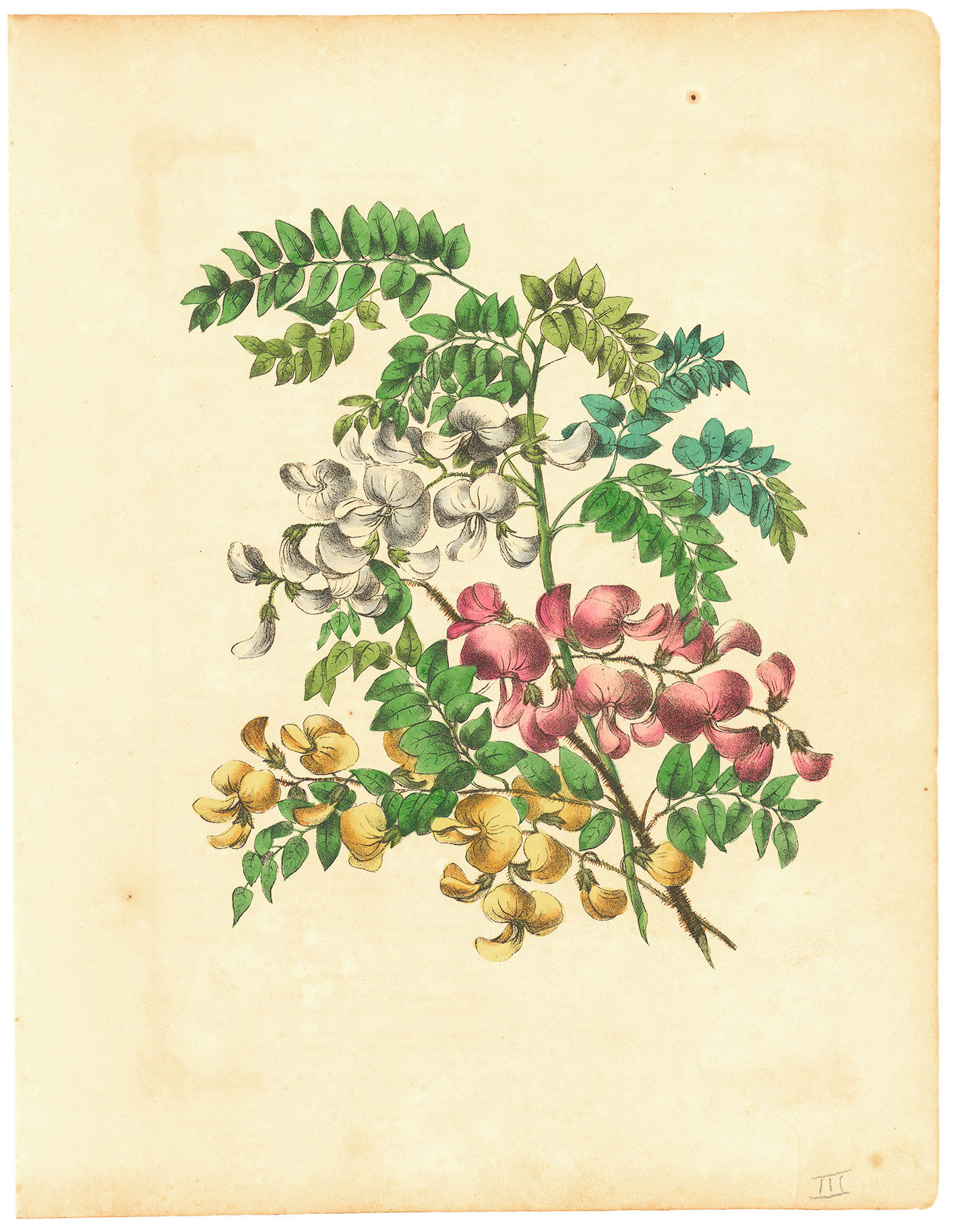 DESCRIPTION: Scarce lithograph with original hand color. From "Flora's Dictionary," by Mrs. E.W. Wirt of Virginia. Embellished by Mrs. Anna Smith. Mrs. Wirt's book is one of the earliest colored botanical works published in America. Rather than depicting a single flower, each plate shows a carefully selected grouping. As Bennett notes, "The arrangements of flowers are beautifully balanced and the coloring is brilliant." (Bennett, "American Color Plate Books, 115).