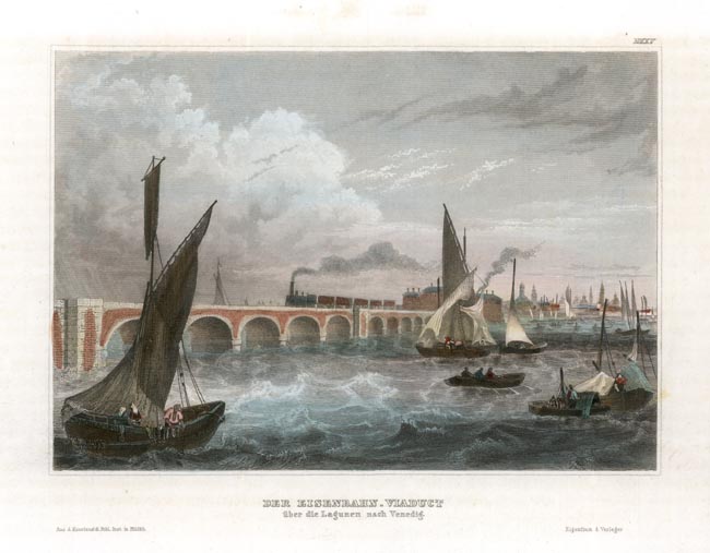 DESCRIPTION: View of a train on a viaduct with boats in the foreground and Venice in the distance.
