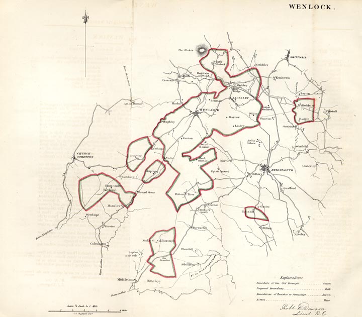 DESCRIPTION: A plan of the town of Wenlock, part of Shropshire, mid west coast of England. Scale 1/2 inch to 1 mile. G. G. Chappell Del. Includes text.