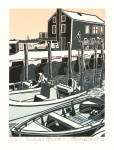 ”I am interested in creating a mood or the feeling of certain weather or time of day with the colors I use. A third or fourth block is added if I feel it is necessary, but many times I use two blocks. In the proofing stage, I draw and paint on a proof until I find the colors I want to use. When I am ready to print an edition (usually 50 prints with five artist's proofs), I mix the colors, bearing in mind that one color printed over another makes a third color.”
