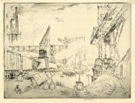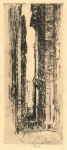 Pennell traveled to Europe in 1881 to illustrate some of the Italian writings of W.D. Howells. While in Europe, Pennell was commissioned by Philip Gilbert Hamerton to illustrate a book about the Saone River. This commission brought him fame and soon he was collaborating with Henry James, Justin McCarthy, and Sir Walter Besant, illustrating the buildings and streets of London. Pennell completed over 1800 etchings and lithographs, executed mostly in Europe before 1917. He destroyed nearly all of his early plates to prevent worn-out re-prints from finding their way onto the market.